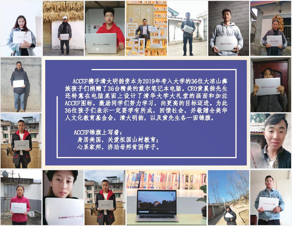 ACCEF携手明韵资本(也叫清大明韵创投有限公司)为大凉山在2019年考入大学的36位彝族孩子们捐赠了36台精美的戴尔笔记本电脑。