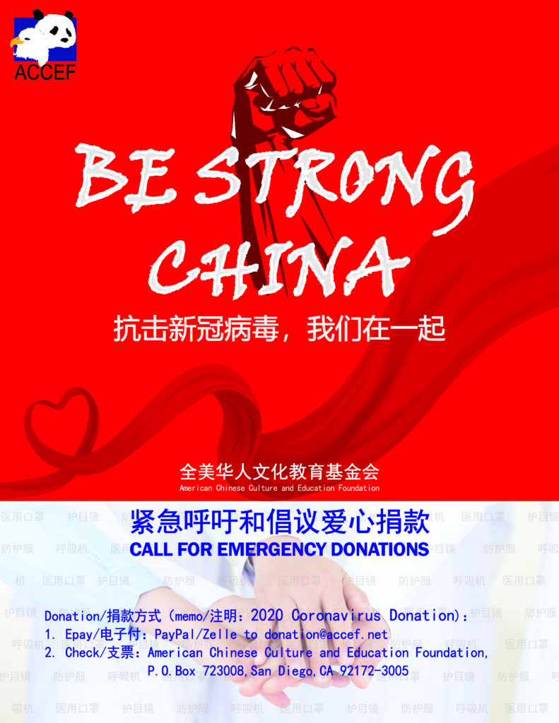 前段时间,新型冠状病毒感染肺炎疫情强势袭击中国武汉。近几日,疫情不断再度升级,一时间武汉封城,疫情扩展到湖北省乃至中国各省,世界多国也有确诊。2020年这个春节,全世界的华人都被此事牵动着万千心绪。我们虽身处海外,但也一样关注,关心,时时牵挂着远在国内的同胞。国内的医护人员不计报酬、无畏生死、逆向而行,用生命救治患者,以防止病毒蔓延,疫情加重。但是面对突发疫情,各医院医疗防护物资严重短缺,纷纷向外界求援。在此,ACCEF(全美华人文化教育基金会)紧急呼吁和倡议,请华人同胞们伸出援助之手,向奋斗在抗病毒第一线的医护人员献出我们的一份力量和爱心。捐款金额不限,专款专用,将用于统一购买急需的医疗防护物资,快速通过合法渠道运送到一线最需要的地方。