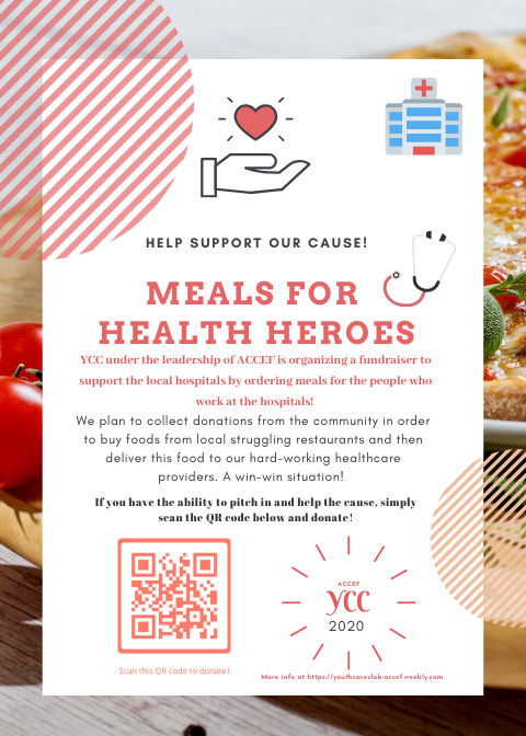 Currently, YCC under the leadership of ACCEF is organizing a fundraiser called “Meals for Health Heroes”. We plan to collect donations from the community in order to buy foods from local struggling restaurants and then deliver this food to our hard-working healthcare providers. A win-win situation!